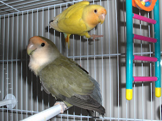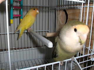 Casal de agapornis, macho verde com duplo factor de escurecimento e com mutação aqua.